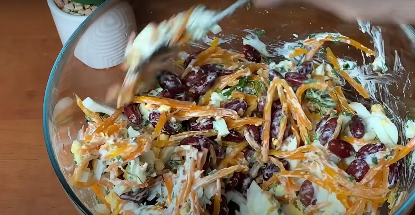 the green onions and dill finely and add them to the beans, carrots and eggs. Salt the salad, dress it with a mixture of mustard and sour cream. Thoroughly mix all the components with each other.
