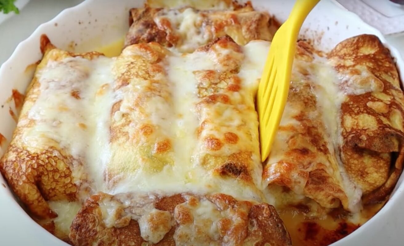 meat. Chop parsley and green onions finely, mix with the rest of the stuffing, dress with mayonnaise. Put the stuffing in the pancakes, seal the inside with an envelope.