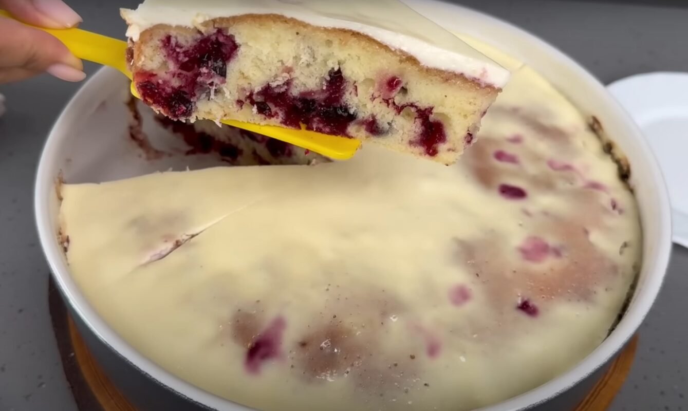 Pour the berries into the batter, mix gently with a silicone spatula and pour into the mold. In advance, grease the baking mold with vegetable oil and sprinkle with flour.