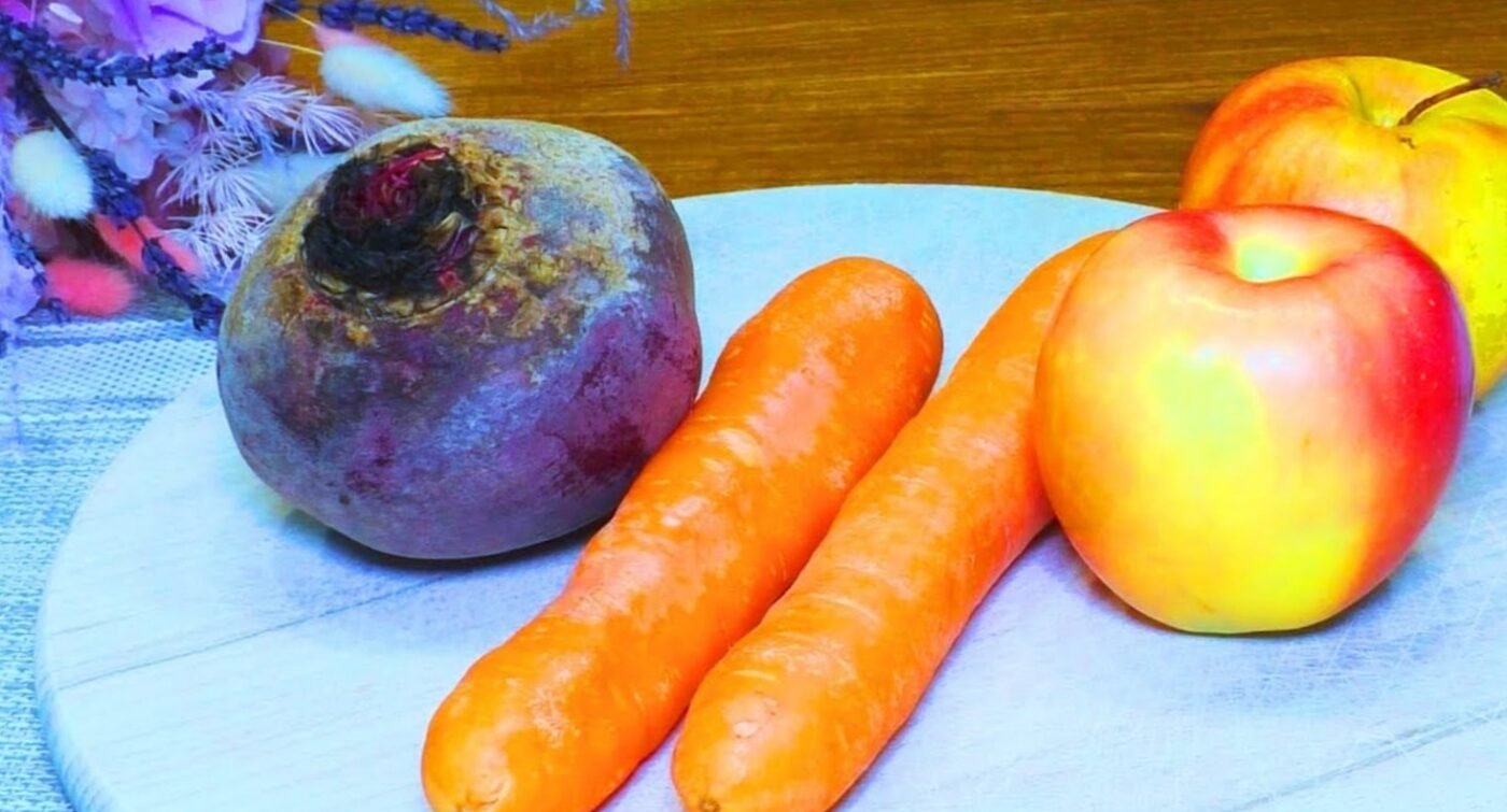 . Pour lemon juice over apples, mix them in a bowl with beets and carrots. For dressing squeeze orange juice, add olive oil, honey, French mustard and salt, mix.