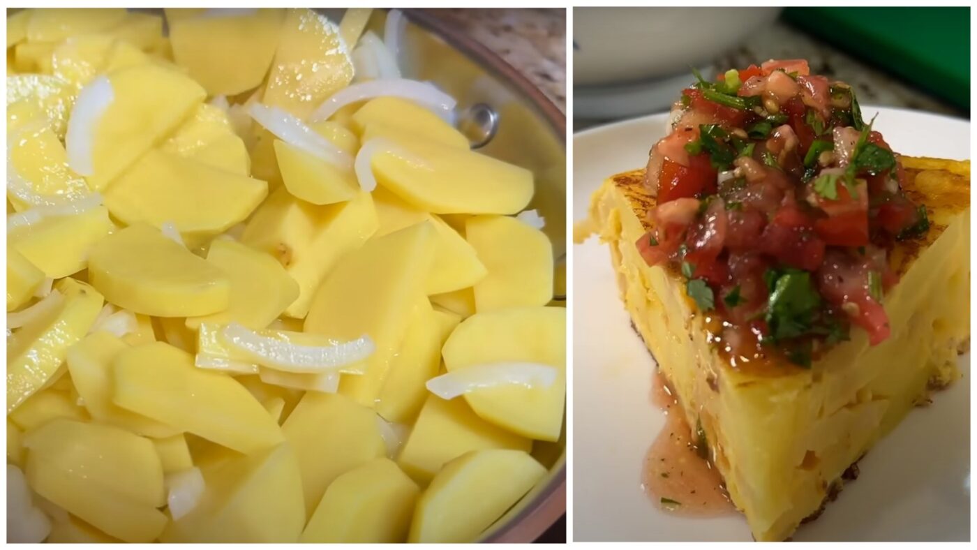 Remove the potatoes and onions from the skillet to a colander. It is important to let all the oil drip off the potatoes. We send the hot potatoes to the bowl with eggs, stir and leave for a couple of minutes.