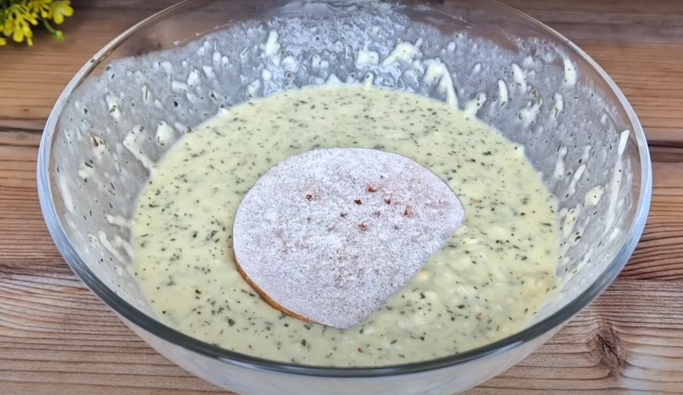 Grate the cheese on the small sharps of a grater. In a bowl break eggs, mix with sour cream, seasoning for meat, dry parsley, cheese and mix.