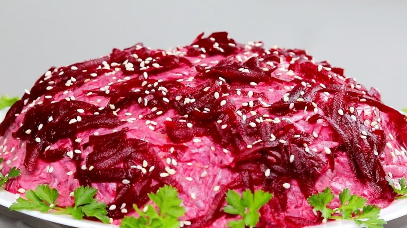 It turns out a simple salad from available products. This is quite a good alternative to “Herring under a fur coat” for those who do not like herring.