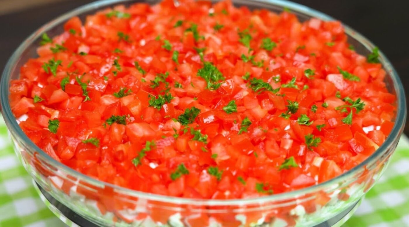 . Lay the layer of tomatoes on the mayonnaise. Decorate the top of the salad with dill.