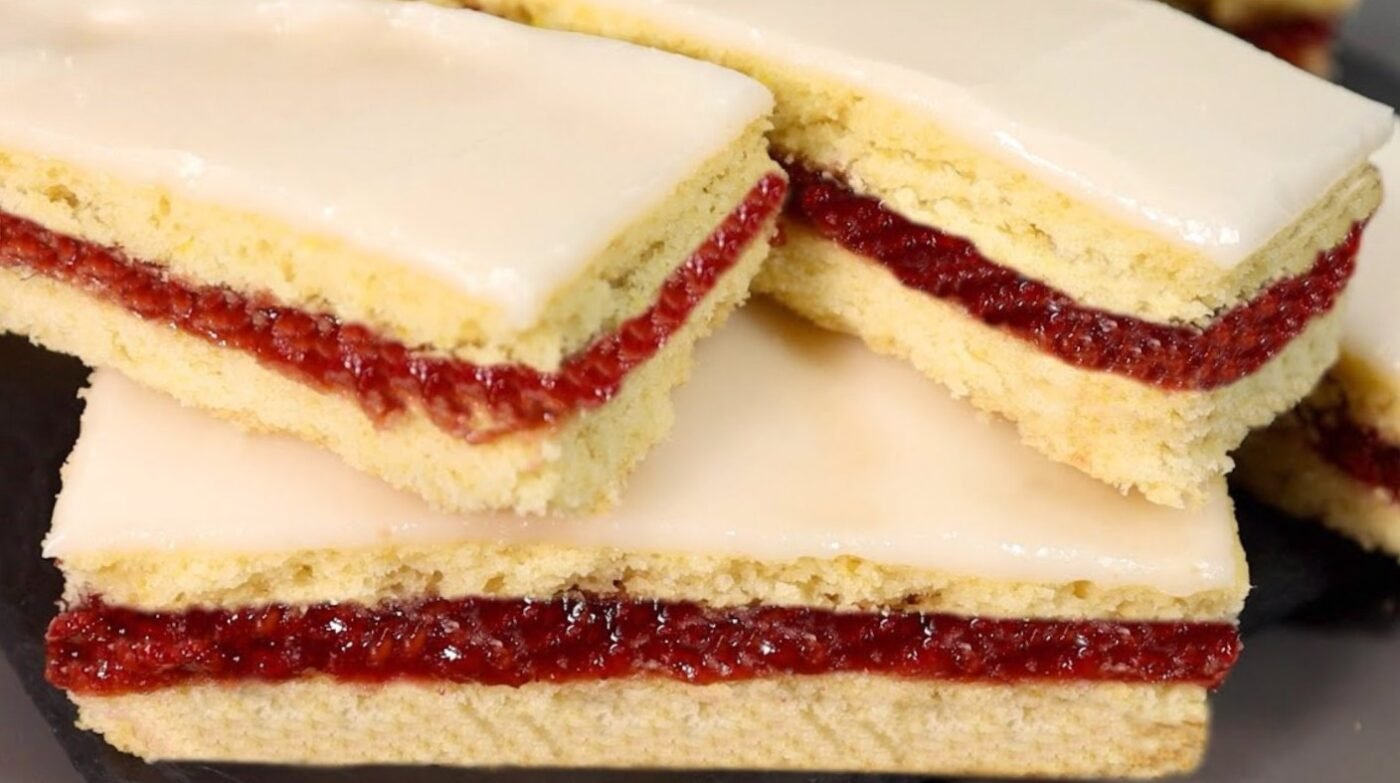 It is recommended to dip the knife in boiling water before cutting. You will get even and beautiful strips with jam for a tea party.