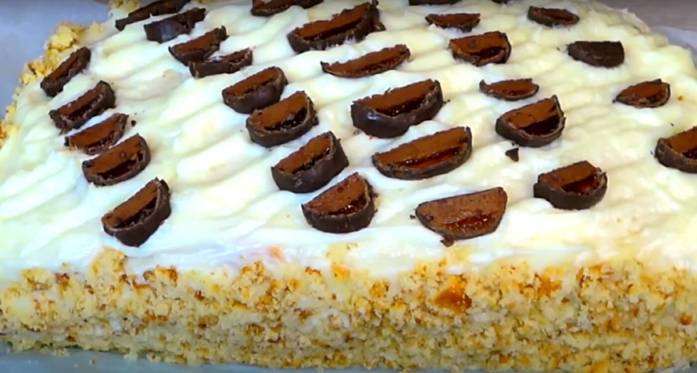 the cake. Lubricate the sides of the cake and the top, cover the sides with shredded sponge cake. Leave the cake in the refrigerator for 2-3 hours.