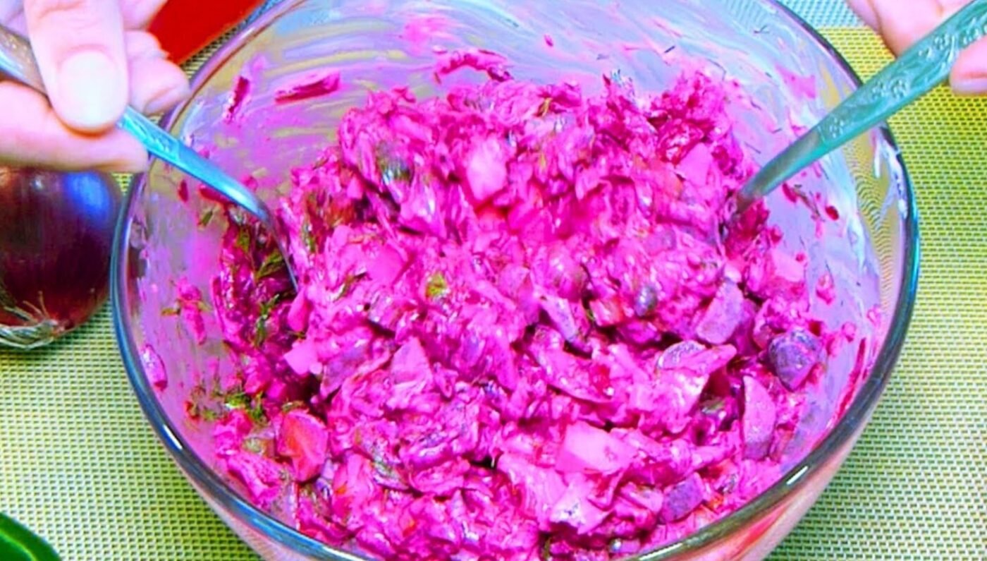 . Mix beets with eggs, cheese, potatoes and pickles in a salad bowl. Dice red onion, chop parsley