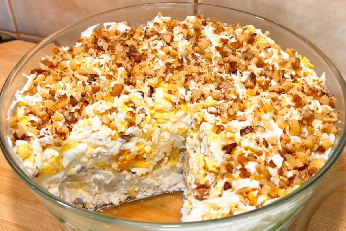 For decoration sprinkle the salad with chopped nuts and leave for 1 hour in the refrigerator.