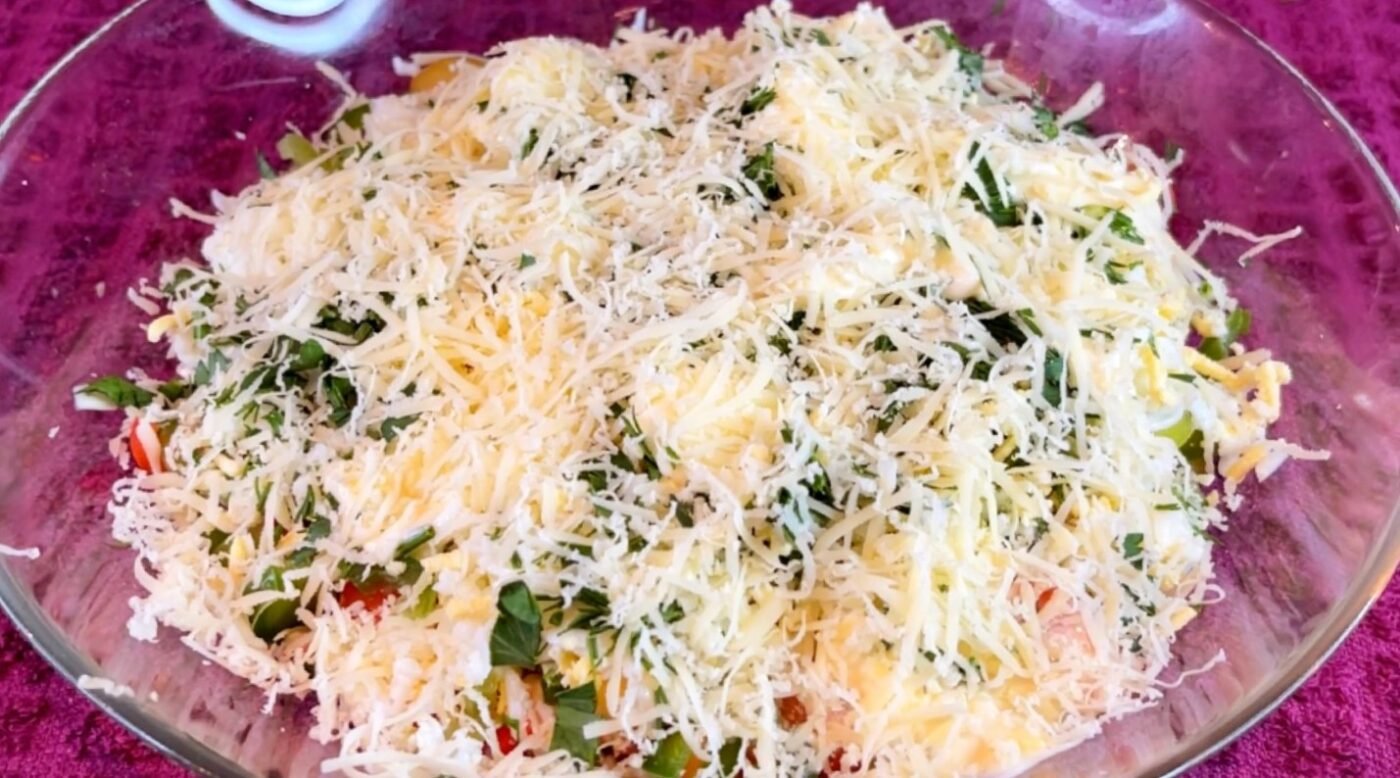 Drop mayonnaise on this layer – the drops should be far away from each other. Grate cheese on a fine grater on top of the salad.