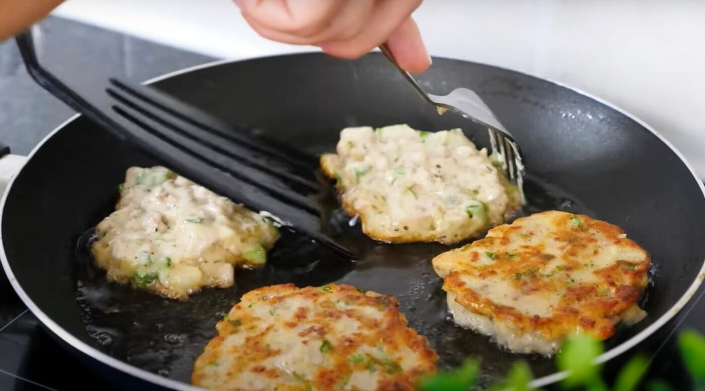 Heat vegetable oil in a frying pan, place a tablespoon of dough with meat on the surface.
